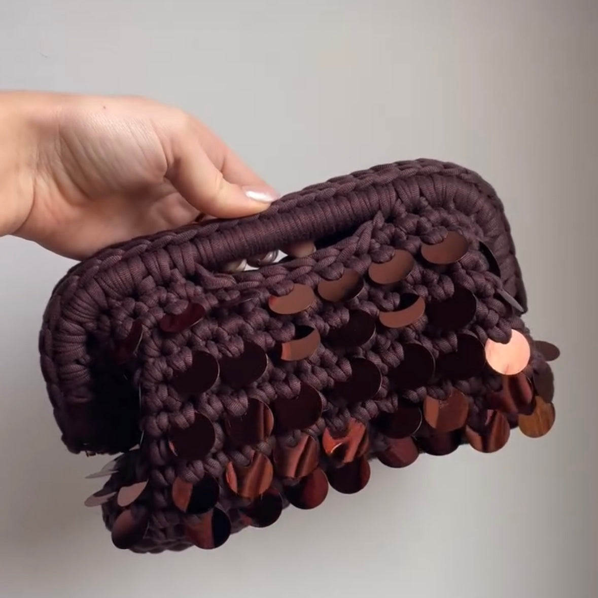 Le paillettes, con i loro riflessi cangianti color rame, creano un contrasto mozzafiato con il marrone scuro della trama, catturando lo sguardo e rendendo ogni tuo movimento una dichiarazione di stile unica e preziosa. La maniglia integrata e la chiusura magnetica celata completano un design curato nei minimi dettagli, creato per chi desidera distinguersi con una classe ineguagliabile e una brillantezza da vera icona.