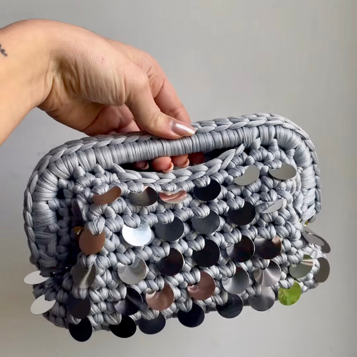 Le paillettes, con i loro riflessi scintillanti color argento, creano un contrasto mozzafiato con la tonalità neutra e fredda della trama, catturando lo sguardo e rendendo ogni tuo movimento una dichiarazione di stile unica e preziosa. La maniglia integrata e la chiusura magnetica celata completano un design curato nei minimi dettagli, creato per chi desidera distinguersi con una classe ineguagliabile e una brillantezza da vera icona.